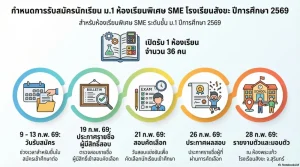 ประกาศเปิดรับสมัครนักเรียน ประเภทห้องเรียนพิเศษ SME เข้าศึกษาต่อระดับชั้นมัธยมศึกษาปีที่ 1 ประจำปีการศึกษา 2569 22 ม.ค. 2569อภิวัฒน์ เพ็ชรเลิศข่าวประชาสัมพันธ์, ข่าวรับสมัคร, ประกาศ ประกาศเปิดรับสมัครนักเรียน ประเภทห้องเรียนพิเศษ SME เข้าศึกษาต่อระดับชั้นมัธยมศึกษาปีที่ 1 ประจำปีการศึกษา 2569 รับสมัคร : 9-13 ก.พ. 69 ณ ห้องเกียรตินิทรรศ อาคาร สข.1 สอบคัดเลือก : 21 ก.พ. 69 ประกาศผล : 26 ก.พ. 69 รายงานตัวและมอบตัว : 28 ก.พ. 69